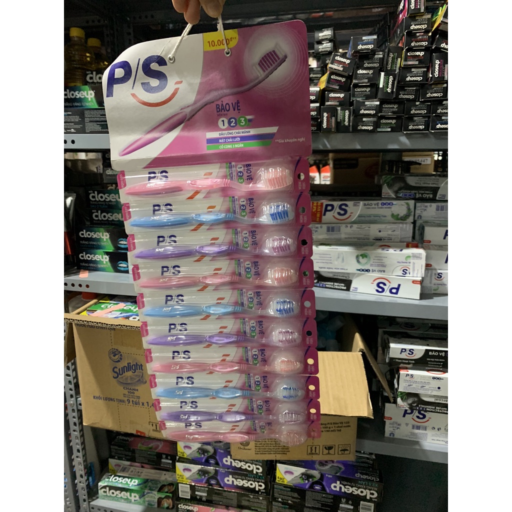 Bàn chải đánh răng thương hiệu P/S nổi tiếng. Bàn chải đánh răng P/S có lông chải mềm mại và mặt chải lưỡi. Bàn chải đánh răng P/S bảo vệ 123 mềm mại ngừa sâu răng, làm trắng răng và giúp làm hơi thở thơm mát.