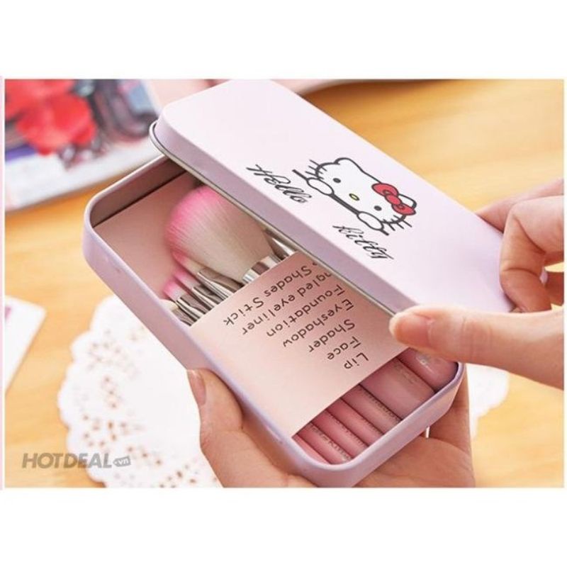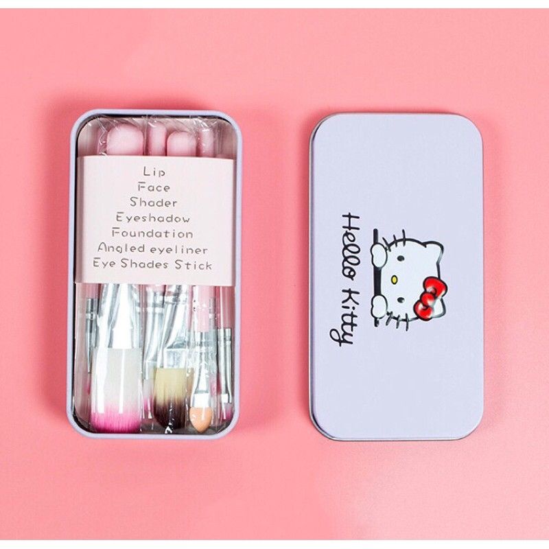 – Cọ Trang Điểm Hello Kitty 7 cây trong hộp nhỏ gọn xinh xắn, lông cọ mềm với màu hồng cực dễ thương.