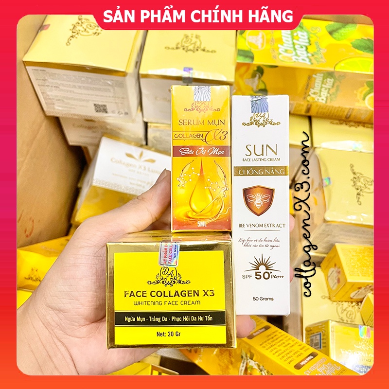 Combo Mỹ Phẩm Đông Anh chính hãng: Kem Face Collagen X3 + Serum Mụn Colagen X3 + Kem Chống Nắng