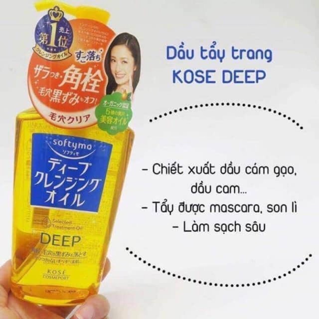 💟Dầu Tẩy Trang Kosé Softymo Cleansing Oil 230ml giúp bạn nhẹ nhàng lấy đi lượng dầu thừa, mụn đầu đen, lớp da bong tróc bên trên và các chất dơ sâu dưới lỗ chân lông đồng thời tẩy đi các lớp trang điểm không trôi cứng đầu nhất. Bên cạnh đó, sản phẩm còn cung cấp độ ẩm, dưỡng giữ ẩm giúp làn da mềm mại, lỗ chân lông thông thoáng. Với sản phẩm này, sau khi tẩy trang, làn da bạn sẽ sạch sẽ và ẩm mịn.