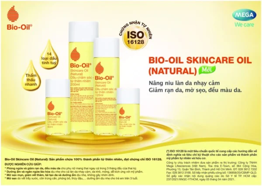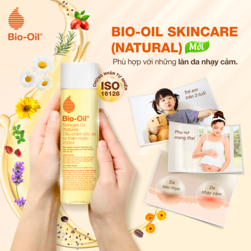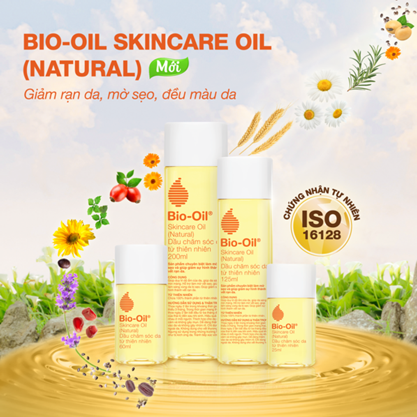 Bio-Oil Skincare Oil (Natural) được công nhận sản phẩm chứa 100% nguồn gốc tự nhiên, đạt chứng chỉ ISO 16128.