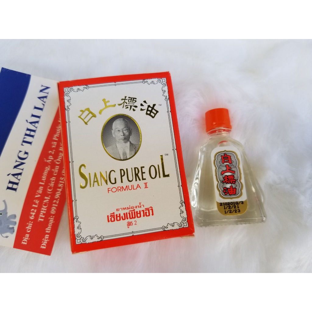 Siang pure oil, một thương hiệu quen thuộc, gần gũi với tất cả mọi người, mọi lứa tuổi, mùi thơm dễ chịu từ tinh dầu giúp làm dịu và giảm ngay những cơn đau đầu, cảm lạnh.Ở Thái Lan dầu Siang pure oil luôn được bày bán ở vị trí trung tâm và là sản phẩm dầu gió bán chạy ở Thái Lan