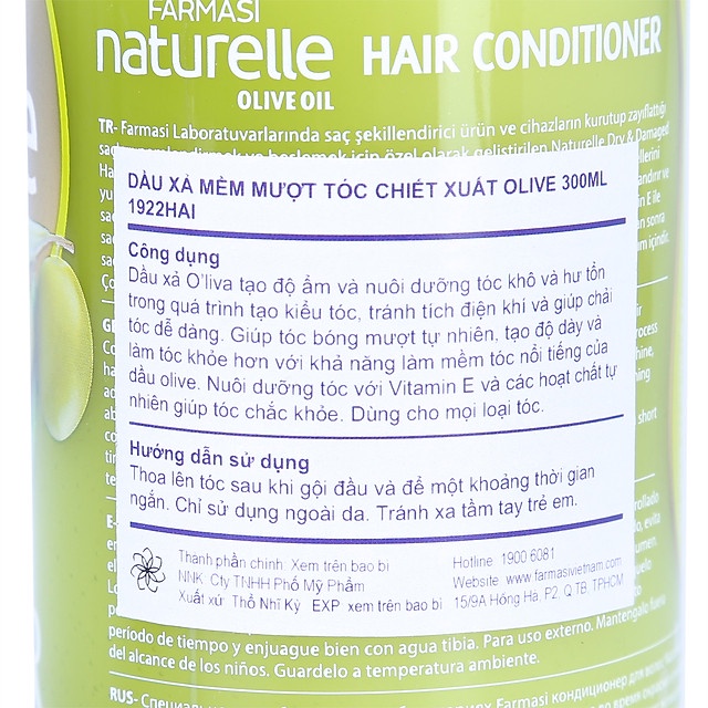 Dầu Xả Phục Hồi Tóc Olive Farmasi O’Liva Hair Conditioner 1922HAI giúp mái tóc khô xơ của bạn trở nên mềm mại và suôn mượt. Dầu xả chứa chiết xuất dầu Olive giàu dưỡng chất nuôi dưỡng tóc không bị xơ, rối và làm tóc bóng mượt tự nhiên. Các hoạt chất tự nhiên có trong thành phần dầu xả giúp bảo vệ tóc khỏi hư tổn bởi các tác nhân bên ngoài và tia cực tím, phục hồi tế bào gốc và bảo vệ lớp bên ngoài, cho bạn 1 mái tóc thực sự chắc khỏe, mềm mại và bóng mượt.