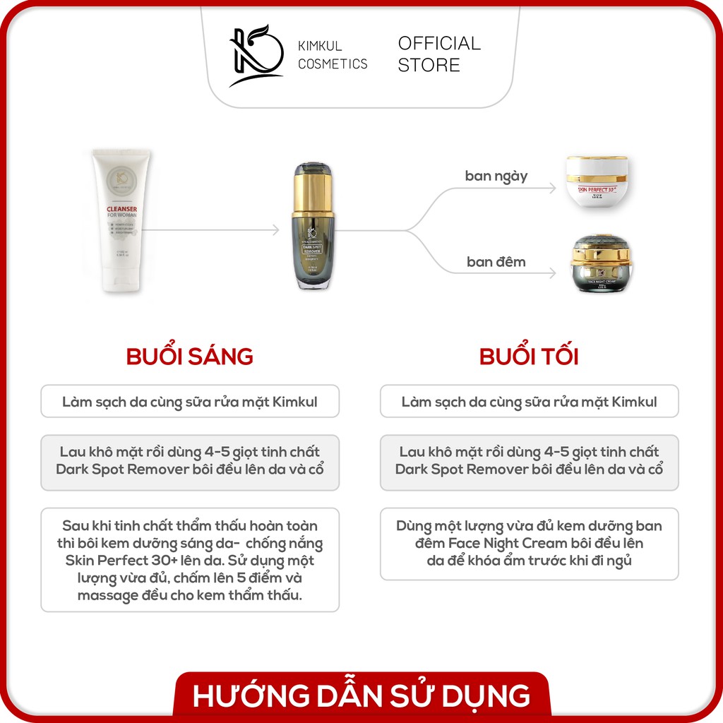 ** Serum giảm thâm nám KimKul Dark Spot Remover 30ML - Huyết thanh xóa tan nám phục hồi da thâm xạm. - Serum Dark Spot Remover 30ML hay còn gọi là huyết thanh xóa tan nám là tịnh chất dạng lỏng và là sự cô đặc của các dưỡng chất cũng như vitamin chăm sóc cho da. - Với những đặc tính trên, serum rất nhanh chóng thẩm thấu sâu vào da và có hiệu quả lên làn da nhanh nhất trong các sản phẩm dưỡng da. Do đó, việc sử dụng serum để phục hồi làn da tổn thương do các vết nám gây ra là một lựa chọn vô cùng phù hợp. Và Dark Spot Removerv sinh ra để làm việc đó.