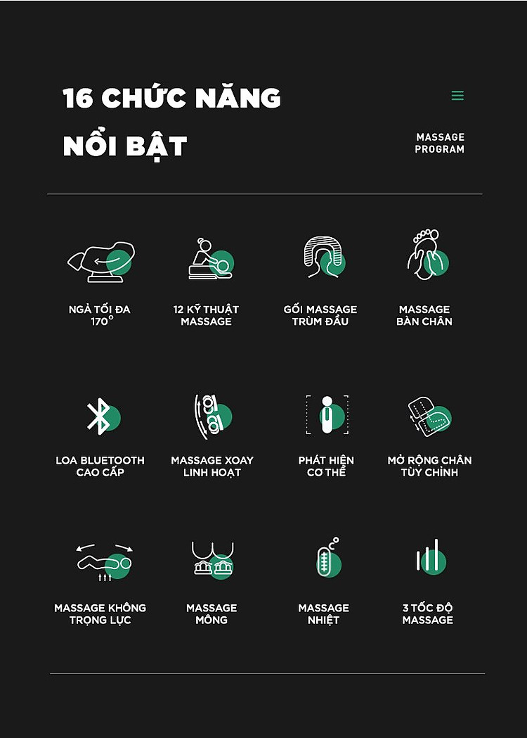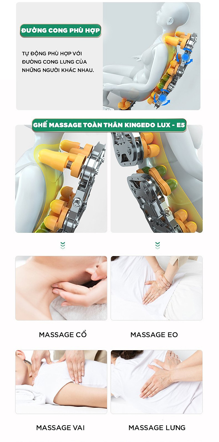 - Con Lăn 3D - Massage Chuyên Nghiệp: Ghế Massage KINGEDO LUX-E5 được thiết lập 6 cấp độ Massage, tích hợp với công nghệ Massage 3D để tác động theo 3 chiều: Rộng, dài, sâu, giúp người sử dụng như đang được những bàn tay của kỹ thuật viên Massage chuyên nghiệp tác động lên những vùng cơ, xương khớp đang bị tổn thương của cơ thể. Bên cạnh đó, máy còn có chế độ điều chỉnh cho phép người dùng kiểm soát linh hoạt sự hoạt động của con lăn đến các vị trí chính xác trên cơ thể theo nhu cầu.