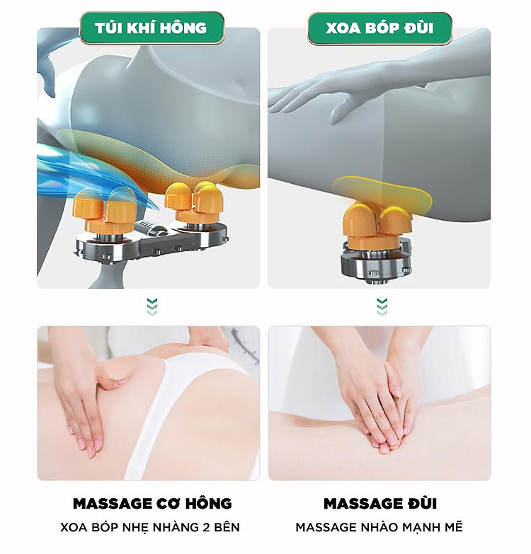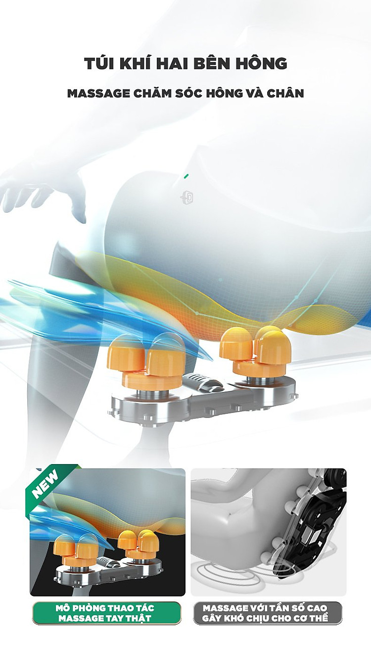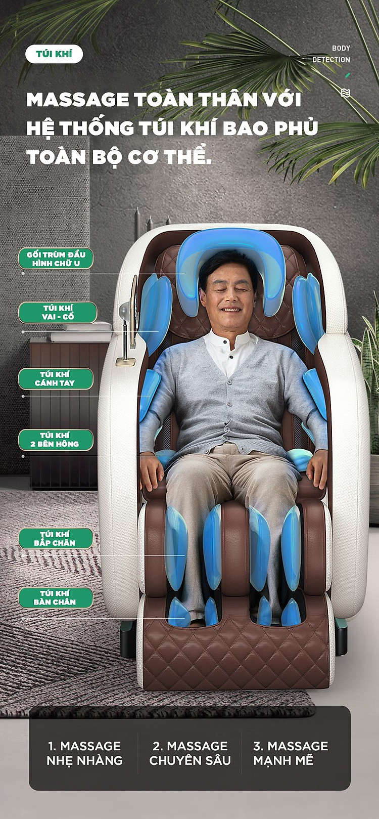 - Túi Khí Toàn Thân, Tăng Trao Đổi Chất: Nếu bạn cảm thấy công nghệ Massage bằng con lăn thỉnh thoảng sẽ khiến bạn cảm thấy bị đau thì hãy chuyển sang ngay chế độ Massage túi khí. KINGEDO LUX-E5 sẽ mang đến cho bạn những cảm giác thực sự thư giãn với hệ thống túi khí trải dọc khắp cơ thể. Theo đó, Massage bằng túi khí sẽ giúp các hệ cơ được co bóp, giãn nở để nhanh chóng làm dịu những cơn đau nhức trong cơ thể.