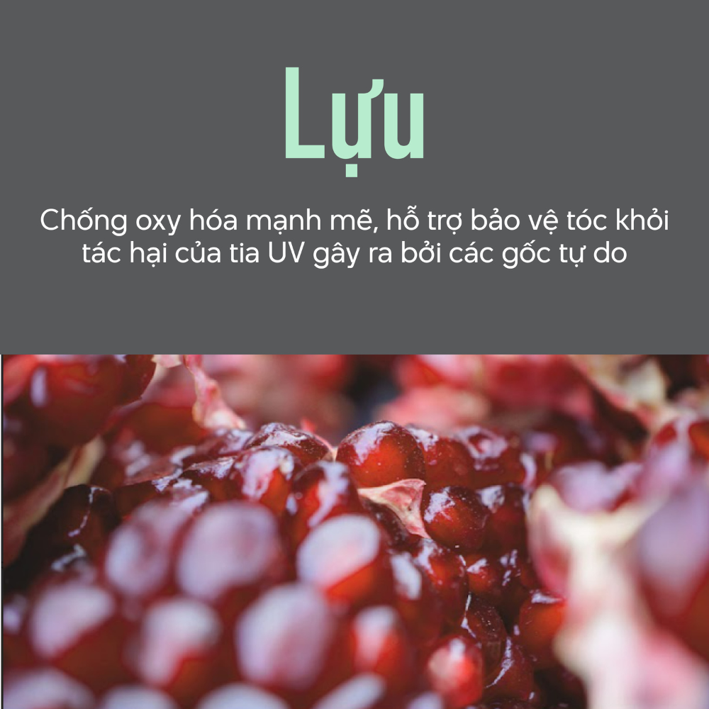- Lựu – được biết đến với tác dụng chống oxy hóa mạnh mẽ, hỗ trợ bảo vệ tóc khỏi tác hại của tia UV do các gốc tự do gây ra. Được chứng nhận ECOCERT.