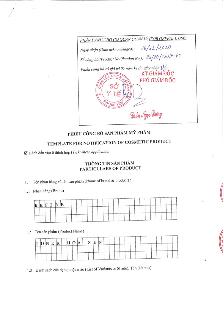 SỐ CÔNG BỐ MỸ PHẨM: 08/20CBMP-PY