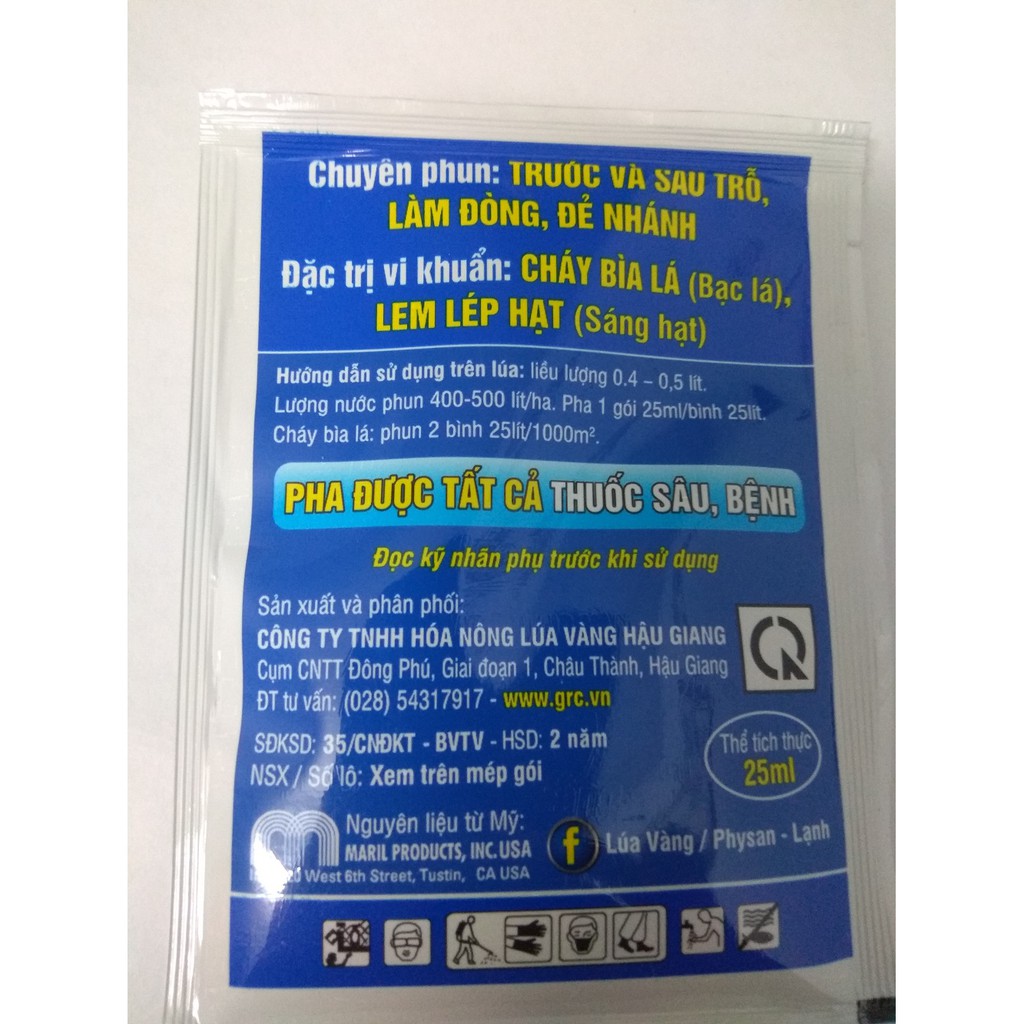 CÔNG DỤNG : Trừ đạo ôn cháy bìa lá, thối nhũn, thối thân, thối hạt do vi khuẩn. Vàng rụng lá và nấm hồng trên cao su, thối nhũn trên phong lan. Chặn đứng sụp lá, thối gốc, đen rễ (Sụp lá do đạo ôn; Thối gốc, đen rễ do thối thân).