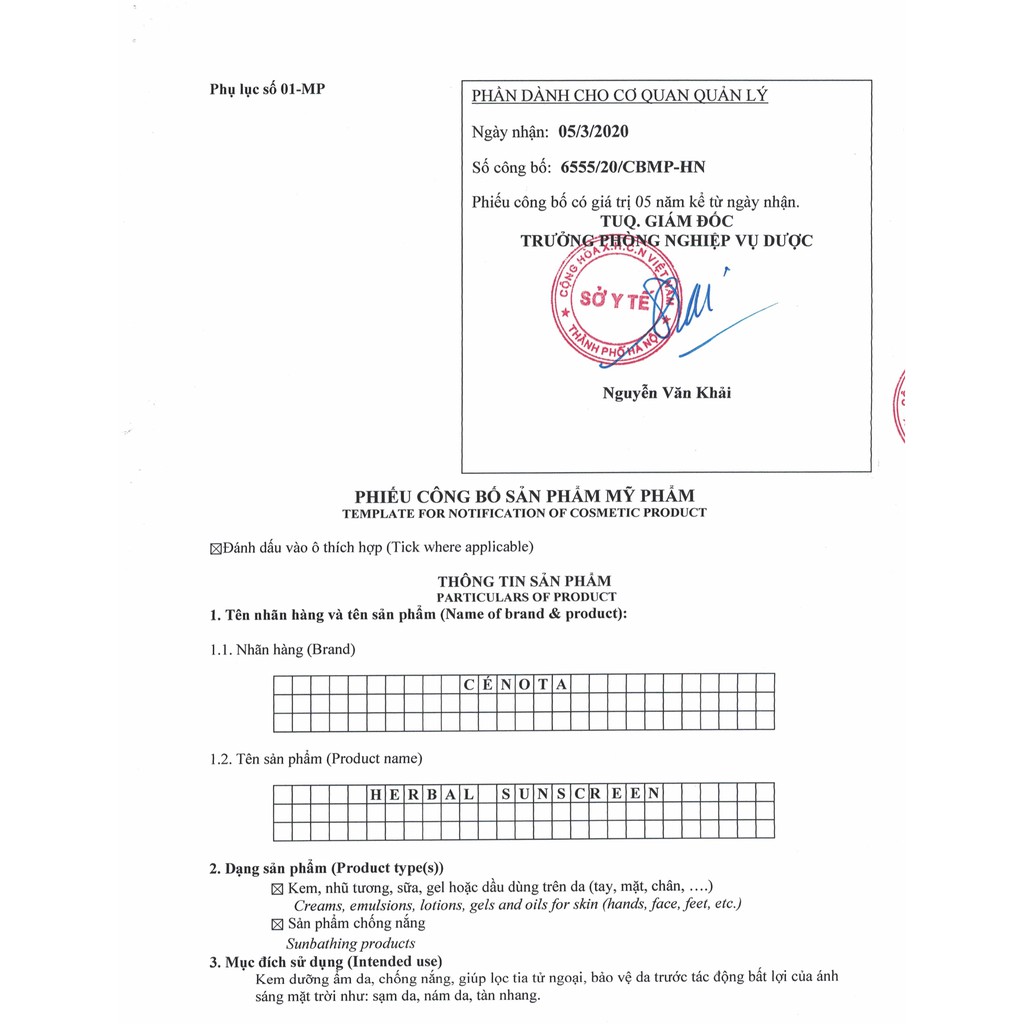 CENOTA cam kết với khách hàng khi mua sản phẩm Kem chống nắng thảo dược, kem chống nắng Herbal Sunscreen - CN01