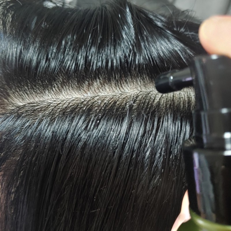 - Rẽ đường ngôi tóc, lắc và xịt tinh chất lần lượt lên toàn bộ da đầu, ưu tiên xịt lên vùng da đầu bị gầu, ngứa và nhiều bã nhờn trước. Để tác động 3-5 phút, sau đó dùng đầu ngón tay nhẹ nhàng mát xa da đầu rồi xả sạch.