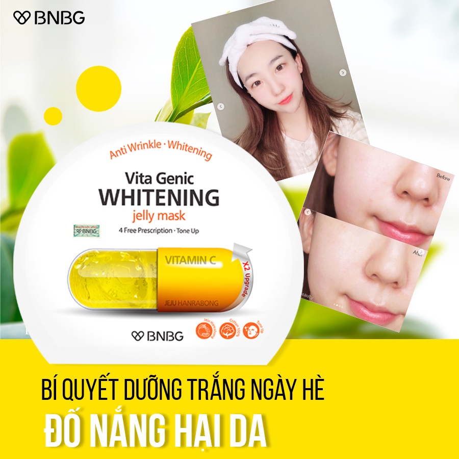 - Mặt nạ Vitamin BNBG Vita Genic Jelly Mask chứa Niacinamide có tác dụng làm trắng đồng thời cải thiện độ ẩm và hỗ trợ giải quyết các vấn đề lão hóa như thâm nám, tàn nhan,... . Kết hợp cùng thành phần Adenosine giúp hỗ trợ tăng sinh collagen tự nhiên trong da, cải thiện sự đàn hồi và độ săn chắc cho da.