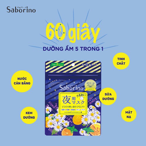 Mặt Nạ Buổi Tối Saborino đến từ thương hiệu mỹ phẩm Saborino (Nhật Bản) là dòng mặt nạ giấy dùng cho buổi tối, với công thức đặc biệt có khả năng thay thế cho 5 bước chăm sóc da: cân bằng ẩm + tinh chất + sữa dưỡng + kem dưỡng ẩm + mặt nạ, giúp tiết kiệm thời gian chăm sóc da mỗi buổi tối, chỉ với 60 giây đắp mặt nạ mà vẫn đảm bảo cung cấp đầy đủ dưỡng chất cho làn da luôn khỏe mạnh, mịn màng và đẹp rạng rỡ vào sáng hôm sau.
