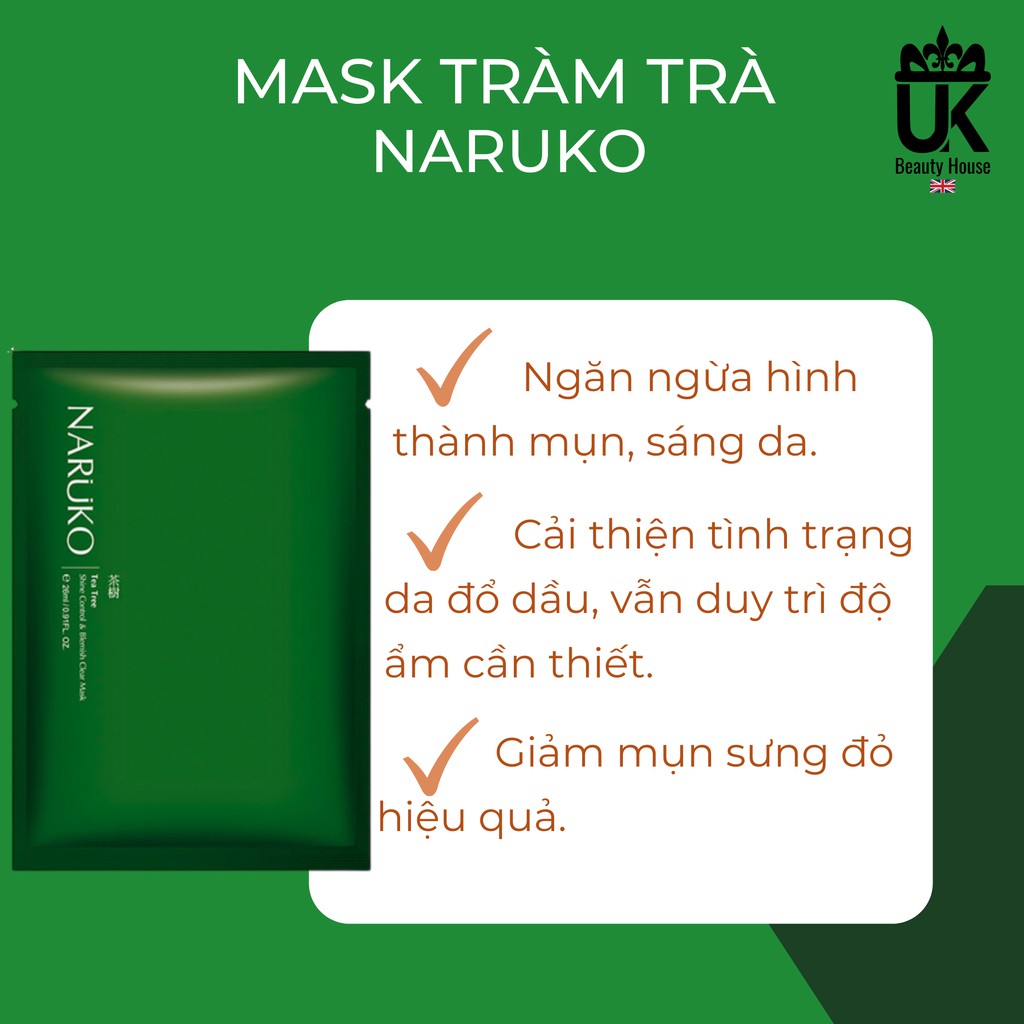 MẶT NẠ KIỂM SOÁT DẦU VÀ MỤN TRÀM TRÀ NARUKO TEA TREE 26ML/MIẾNG (BẢN ĐÀI LOAN)