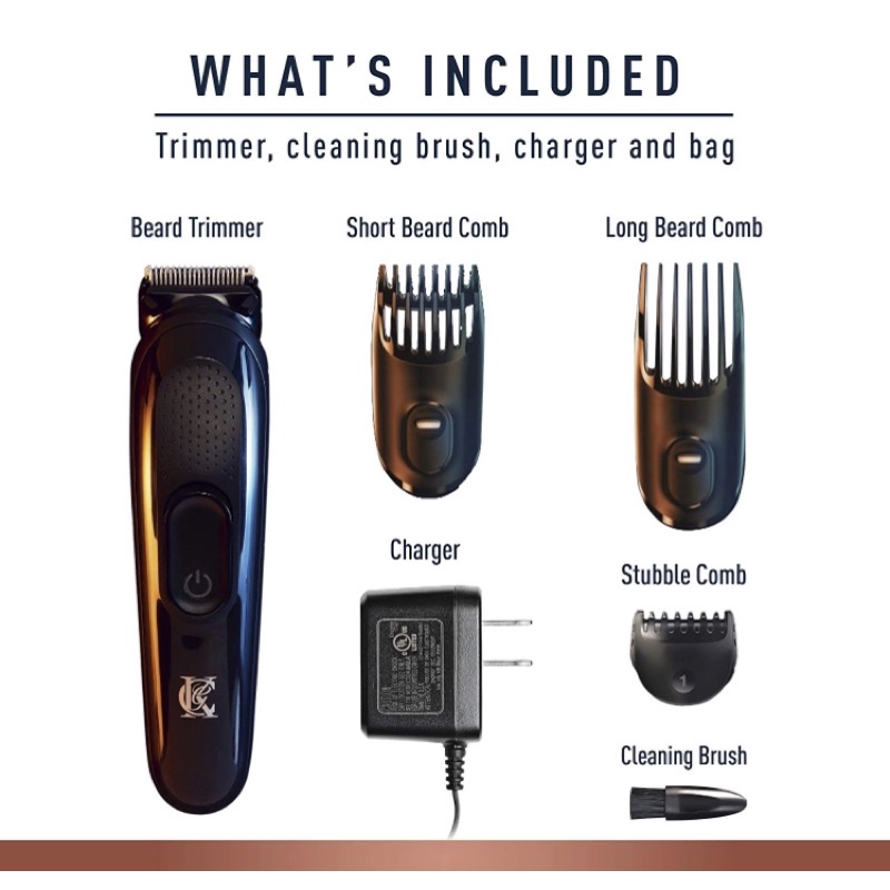 Bao gồm: máy tỉa râu không dây, lược râu ngắn, lược râu dài, lược tỉa râu, sạc và chổi làm sạch