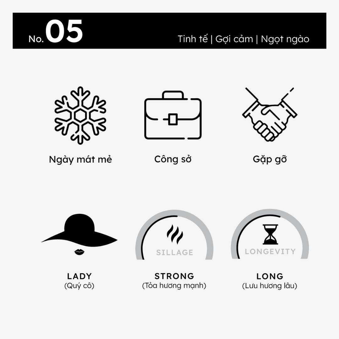Là hai note hương chính của No.05 (Osmanthus 16), hoa thủy tiên (narcissus) sở hữu hương hoa cỏ mùa xuân, hòa lẫn chút hăng nhẹ của cỏ khô. Kết hợp với note hương sang trọng, không kém phần tươi mát của hoa huệ (tuberose), đã mang đến một No.05 thanh lịch và đầy nữ tính. Không quá nồng nàn, nhưng đây sẽ là dấu hương khiến ai đó nhớ mãi không quên.