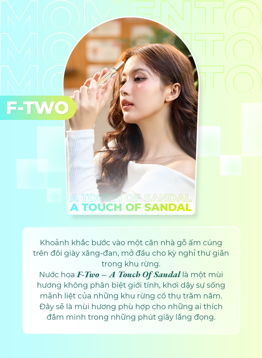 Khoảnh khắc bước vào một căn nhà gỗ ấm cúng trên đôi giày xăng-đan, mở đầu cho kỳ nghỉ thư giãn trong khu rừng. Nước hoa F2 – A Touch Of Sandal là một mùi hương không phân biệt giới tính, khơi dậy sự sống mãnh liệt của những khu rừng cổ thụ trăm năm.