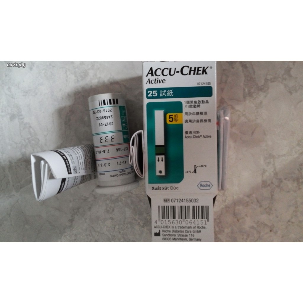Que thử đường huyết Accu-Chek Active là sản phẩm chính hãng, miệng lọ có nắp nhựa bảo hiểm đặc biệt hút ẩm, hạn chế tối đa việc hỏng que thử.Que thử rời và lớn dễ dàng cầm và bỏ vào máy, cũng như tháo bỏ, rất tiện dụng.Khi mở nắp hộp có không khí vào hộp, que thử chỉ được sử dụng trong vòng 3 tháng.Bên trong mỗi hộp có một thẻ chip code đi kèm, nhằm tránh làm giả, chip code sẽ được gắn vào máy để nhận dạng que thử, và chỉ làm mỗi khi thay hộp que thử mới. Mỗi que thử chỉ dùng được 1 lần.