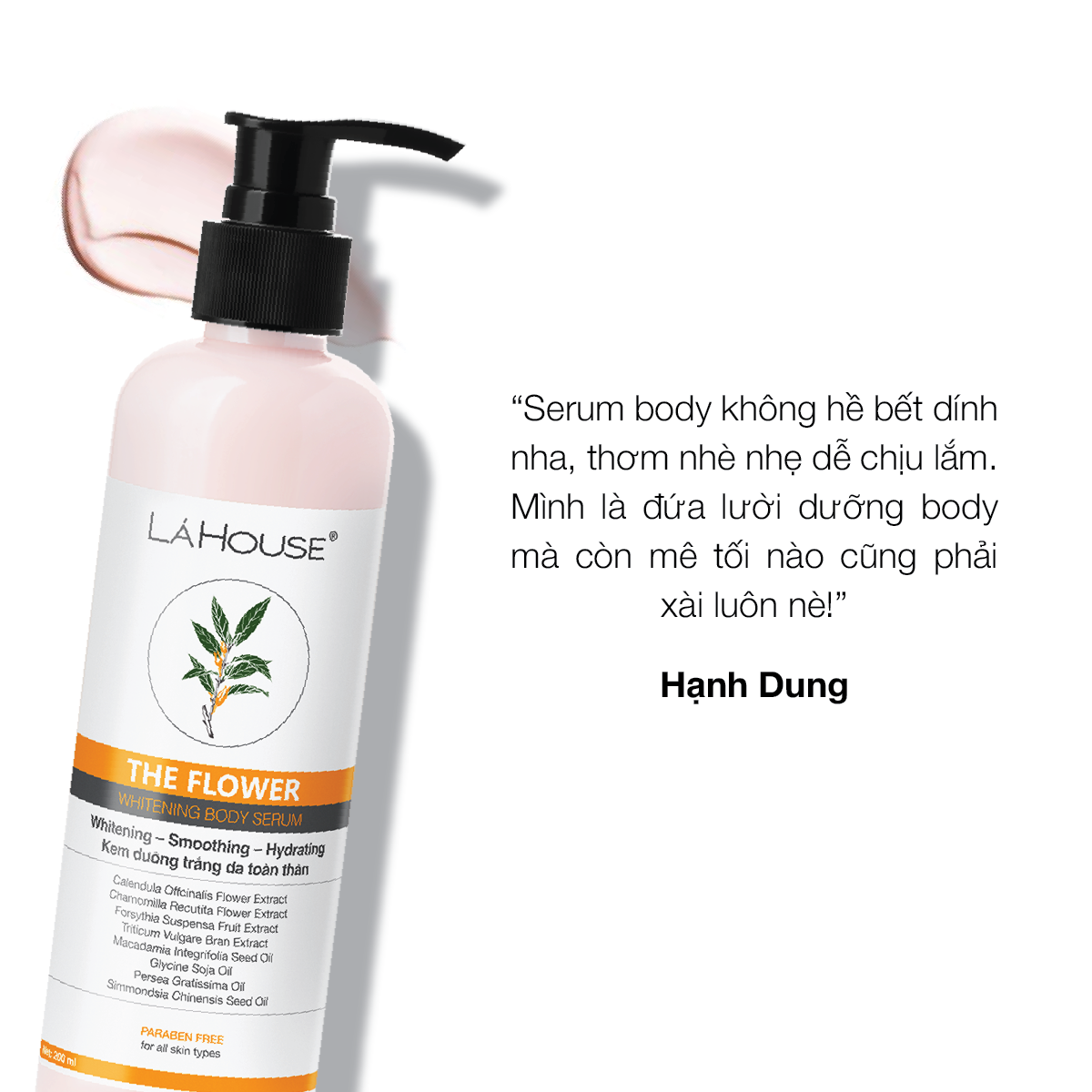 The Flower Whitening Body Serum với các chiết xuất tự nhiên được giới mỹ phẩm đánh giá cao trong việc dưỡng trắng da, cung cấp nguồn dưỡng chất giúp dưỡng da trông trắng khỏe, căng mịn. Sản phẩm ở thể serum thấm nhanh vào da, không gây nhờn rít với hương thơm từ các chiết xuất thiên nhiên dịu nhẹ.