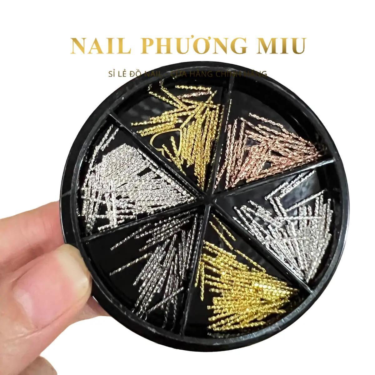 Sản phẩm “Set charm thẳng kim loại làm nail khay nhựa tròn 6 ngăn mix màu cao cấp trang trí móng vàng, bạc và đồng” của thương hiệu Nail Phương Miu là một lựa chọn tuyệt vời để trang trí móng. Dưới đây là mô tả chi tiết về sản phẩm: