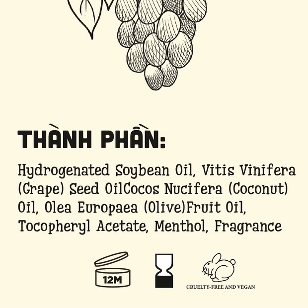 100% từ thiên nhiên: Sáp ong, Sáp Carnauba, Dầu dừa, Dầu Olive, Dầu Hạnh Nhân, Vitamin E....