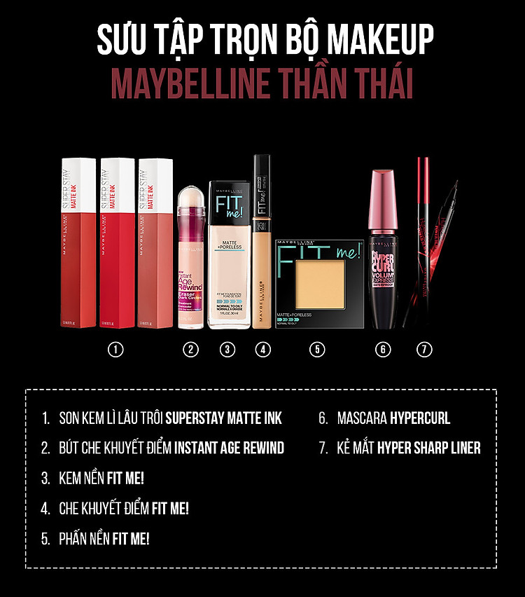 Sở hữu toàn bộ sản phẩm bao gồm tẩy trang Mắt môi của Maybelline, bút che khuyết điểm Instant age rewind, phấn Fit Me, bảng phấn mắt The city mini palette, Chì màu Tatoo brown ink pen, Son kem lì Super Stay Matte Ink, Kẻ mắt Hyper sharp liner, Mascara Magnum big shot.