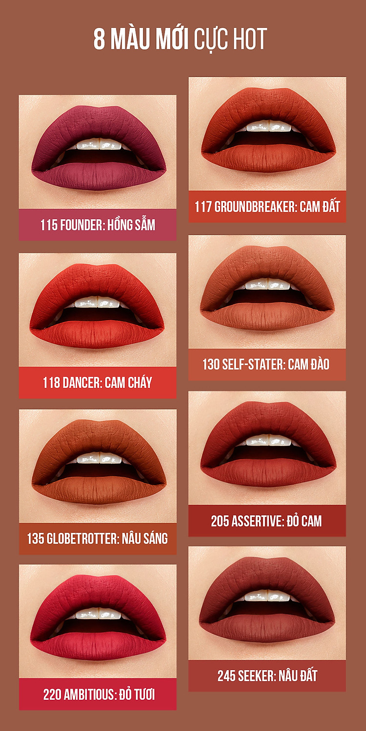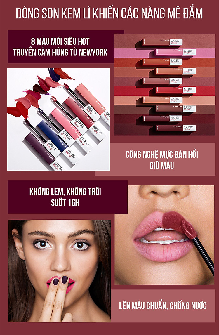 Son Kem lì Maybelline lâu trôi 16 tiếng Super Stay Matte Ink là sản phẩm cháy hàng tại nhiều quốc gia khác nhau, từ các quốc gia Châu Á như Philippines, Thái Lan… đến các nước châu Âu như Mỹ, Úc… với công nghệ mực đàn hồi độc quyền, không lem, không trôi suốt, giữ màu 16 tiếng, chất son kem lì vượt trội, nhiều màu phù hợp nhiều tone da, nay đã có mặt tại Việt Nam.
