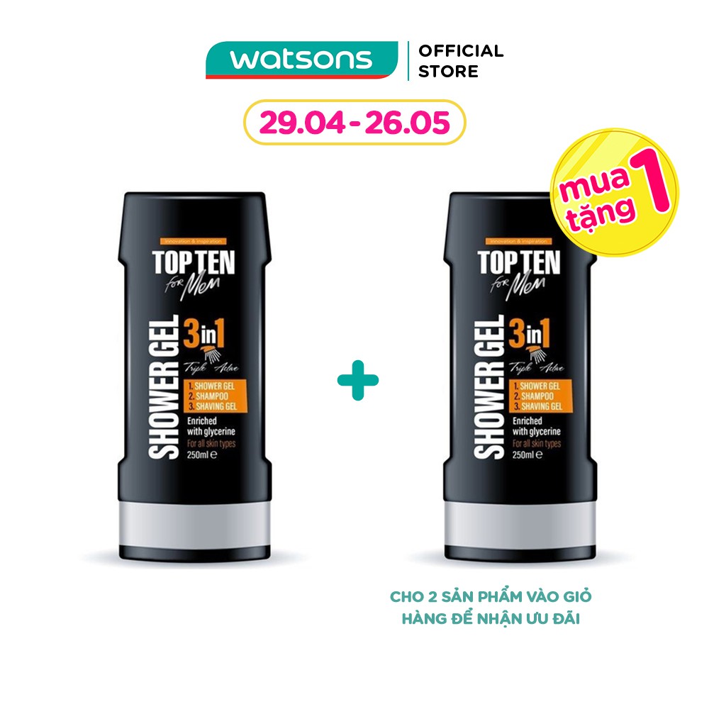 Giới thiệu Sữa Tắm Top Ten For Men 3In1 Shower Gel & Shampoo & Shaving Gel Dạng Gel Gội, Tắm & Cạo Râu 250ml