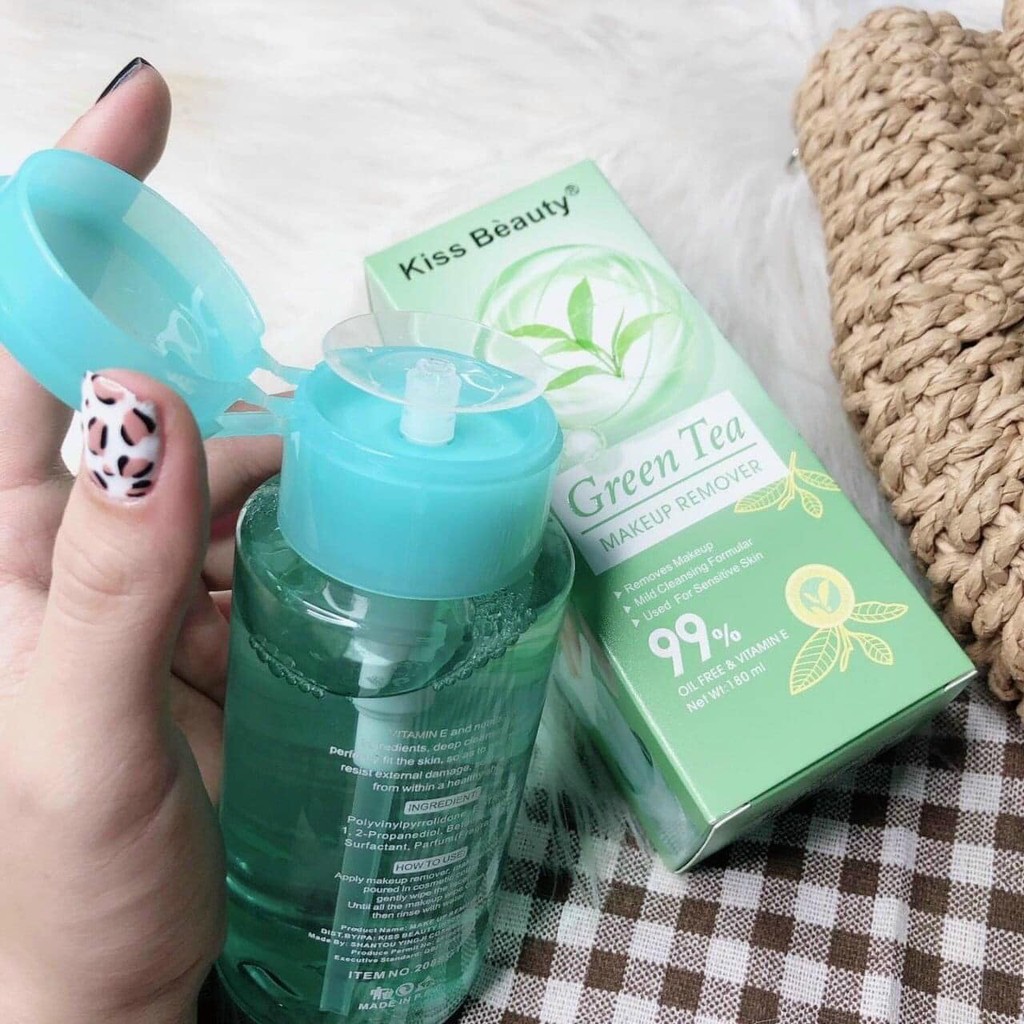 - Nước tẩy trang Kiss Beauty Green Tea 180ml làm sạch sâu da, chăm sóc tăng độ ẩm cho da khoẻ, nuôi dưỡng da sáng hơn