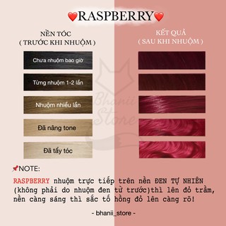 - Thuốc nhuộm tóc màu Raspberry bhanii store có thể được nhuộm trên nền tóc đen. Bạn vui lòng nhắn tin cho chúng mình để được tư vấn thêm về cách nhuộm nhé!!