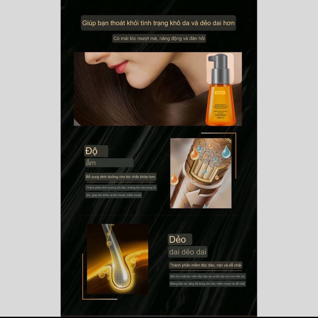 Tinh dầu thẩm thấu cực nhanh vào tóc, phục hồi tóc từ bên trong, cho tóc bóng mượt tức thì mà không làm biến dính hay nặng tóc, giãm thời gian sấy và tạo kiểu đến 50%.