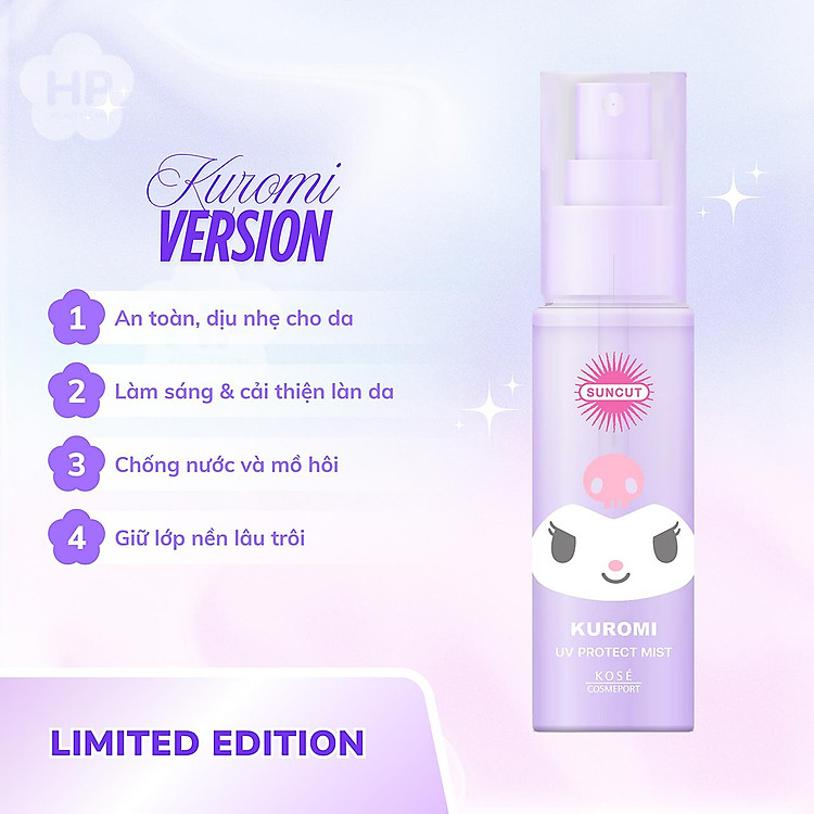 Công Dụng Phiên Bản Giới Hạn Xịt Chống Nắng Bảo Vệ Da Kose Suncut Kuromi UV Protect Mist SPF50+ PA++++ 60 G: