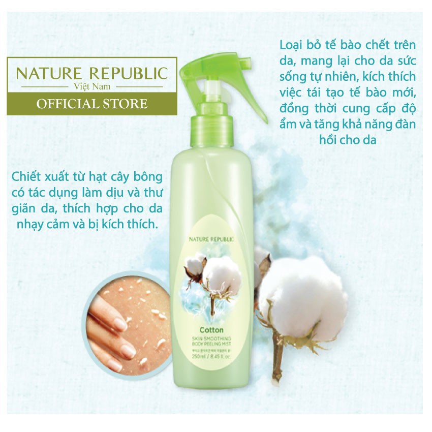 Giới thiệu Xịt tẩy da chết toàn thân Nature Republic SKIN SMOOTHING BODY PEELING MIST COTTON 250ml